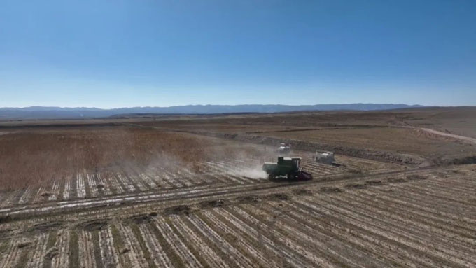 伴隨著收割機隆隆的轟鳴聲,脫粒后的藜麥從收割機倉門傾瀉而下。