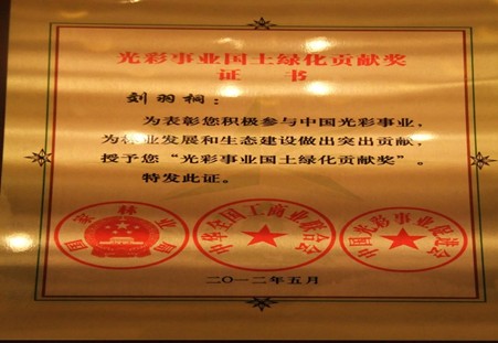 2012年 5月28日,中國(guó)光彩會(huì)四屆三次理事會(huì)在京隆重召開(kāi),全國(guó)政協(xié)副主席、中央統(tǒng)戰(zhàn)部部長(zhǎng)、中國(guó)光彩事業(yè)促進(jìn)會(huì)會(huì)長(zhǎng)杜青林,全國(guó)政協(xié)副主席、全國(guó)工商聯(lián)主席、中國(guó)光彩事業(yè)促進(jìn)會(huì)顧問(wèn)黃孟復(fù),國(guó)家林業(yè)局黨組成員、中央紀(jì)委駐局紀(jì)檢組組長(zhǎng)陳述賢等出席會(huì)議。會(huì)上,由中華全國(guó)工商業(yè)聯(lián)合會(huì)、國(guó)家林業(yè)局、中國(guó)光彩事業(yè)促進(jìn)會(huì)聯(lián)合對(duì)全國(guó)第四屆“光彩事業(yè)國(guó)土綠化貢獻(xiàn)獎(jiǎng)”進(jìn)行了表彰,全國(guó)有44位企業(yè)家獲得“光彩事業(yè)國(guó)土綠化貢獻(xiàn)獎(jiǎng)”。甘肅遠(yuǎn)達(dá)投資集團(tuán)有限公司董事長(zhǎng)劉羽桐女士榮獲中國(guó)第四屆“光彩事業(yè)國(guó)土綠化貢獻(xiàn)獎(jiǎng)”。
