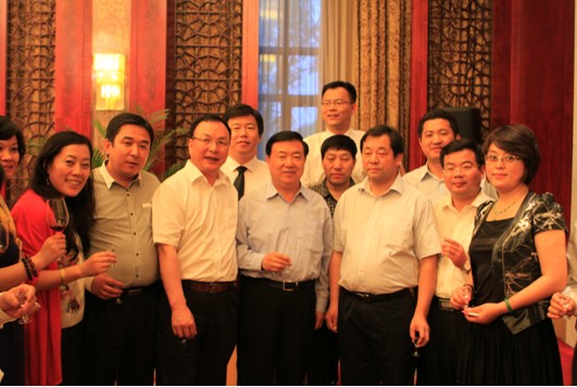 (甘肅省省委書記、省人大常委會主任王三運與商會企業家表合影留念)