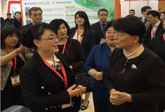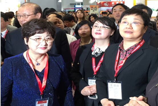 全國(guó)政協(xié)副主席張梅穎(右)參觀中福長(zhǎng)者養(yǎng)老服務(wù)有限公司展會(huì)展廳現(xiàn)場(chǎng)