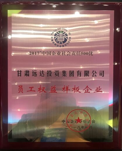 1月28日,在北京召開的第十六屆中國企業發展高層論壇暨2017“中國企業社會責任500優”評價報告發布會上傳來喜訊,遠達集團榮獲“2017中國企業社會責任500優”,在單項評比中榮獲誠實守信樣板企業第三名,員工權益樣板企業第七名。這一成績刷新了甘肅企業在該項評比中的記錄。