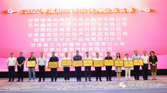 會議還進行了表彰,甘肅純潔高原農業科技有限公司被授予“聯農帶農優秀企業”,被認定為中國銀行“甘味貸”金融產品首批重點支持企業。